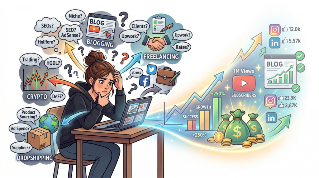 Today, you’re convinced blogging is the way. Tomorrow, you will watch a video on dropshipping. Next week, you’re day-trading crypto, and by the end of the month, you’re trying to be a freelance copywriter.